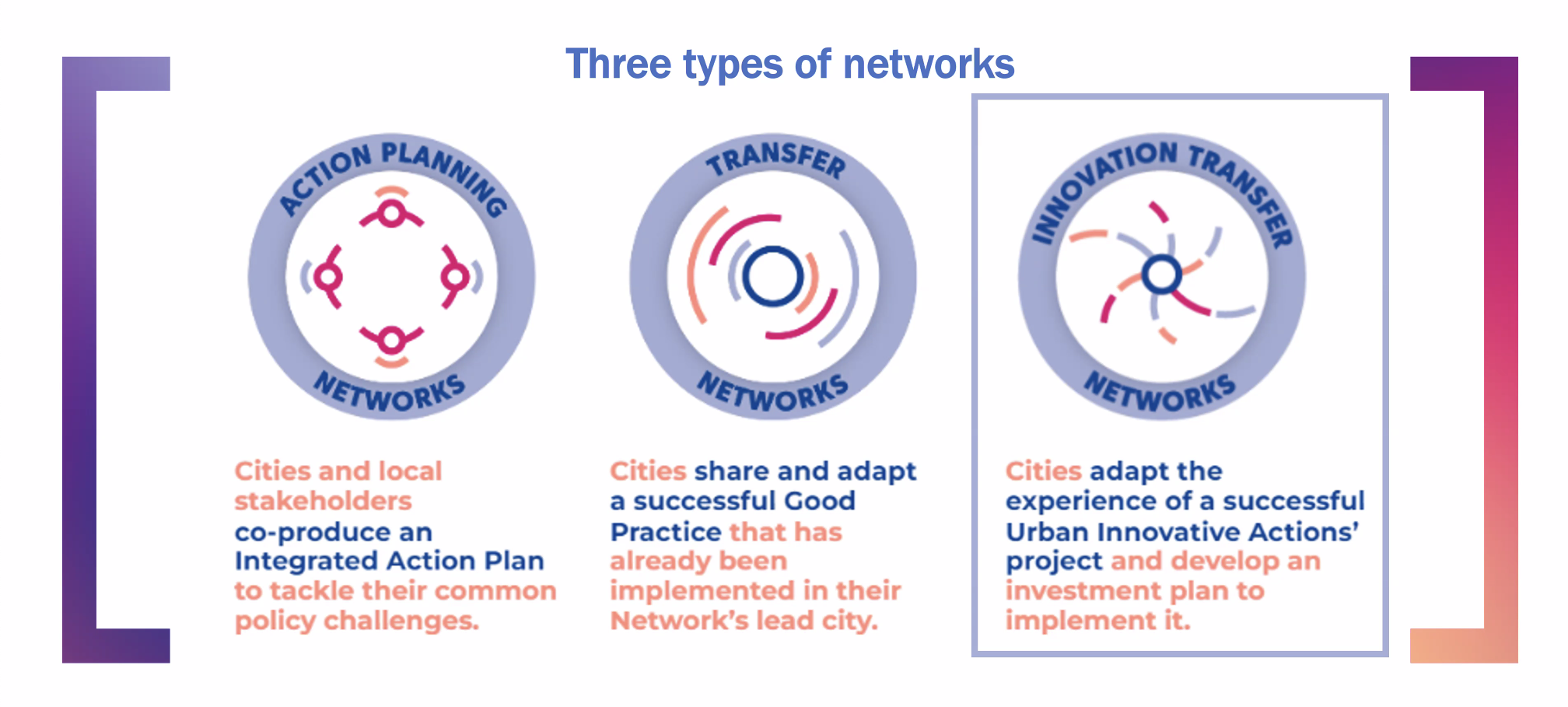 Nelle Reti ITN, le città hanno l'opportunità di trasferire e adattare ai propri contesti locali progetti innovativi, sviluppati nel quadro del programma Urban Innovative Actions (UIA, attivo nel periodo 2014-2020) e dell'attuale European Urban Initiative (EUI). Le ITN dovrebbero sostenere: