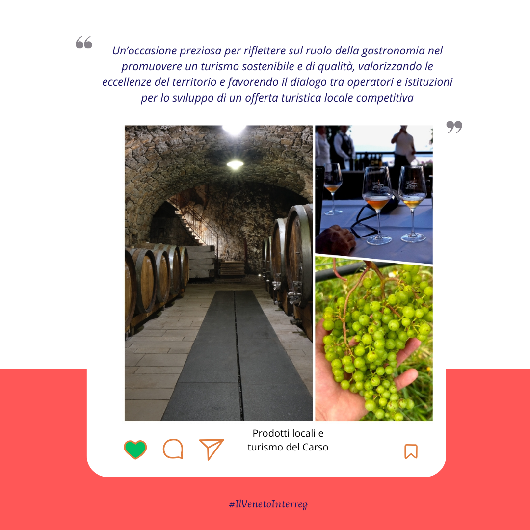 24 giugno 2025: “La gastronomia come motore dello sviluppo sostenibile del turismo – dal Carso al Veneto”, tenutosi il a Noventa di Piave (VE). L’incontro, rivolto agli operatori turistici, ha visto la partecipazione di esperti di economia del turismo e si è concluso con visite alle cantine locali, approfondimenti sui processi di vinificazione e imbottigliamento e casi di marketing aziendale di successo.